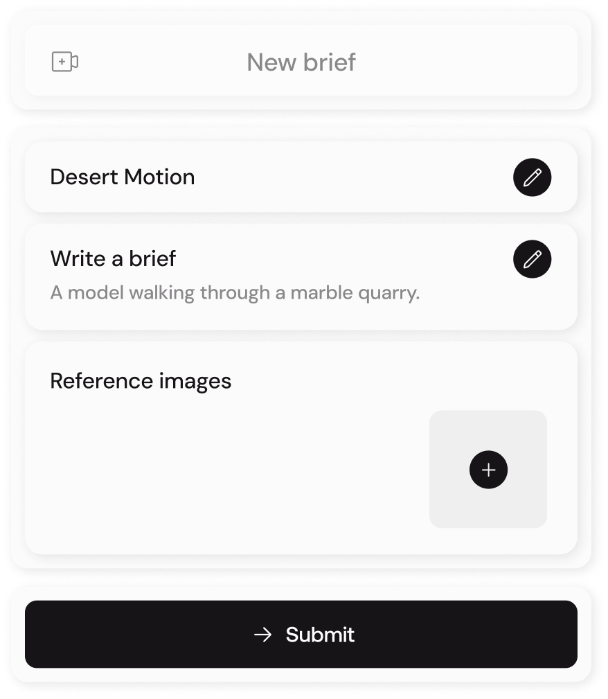 Submit your brief through your private extranet. Combine images and text to show what you mean. No technical setup — just creative intent.